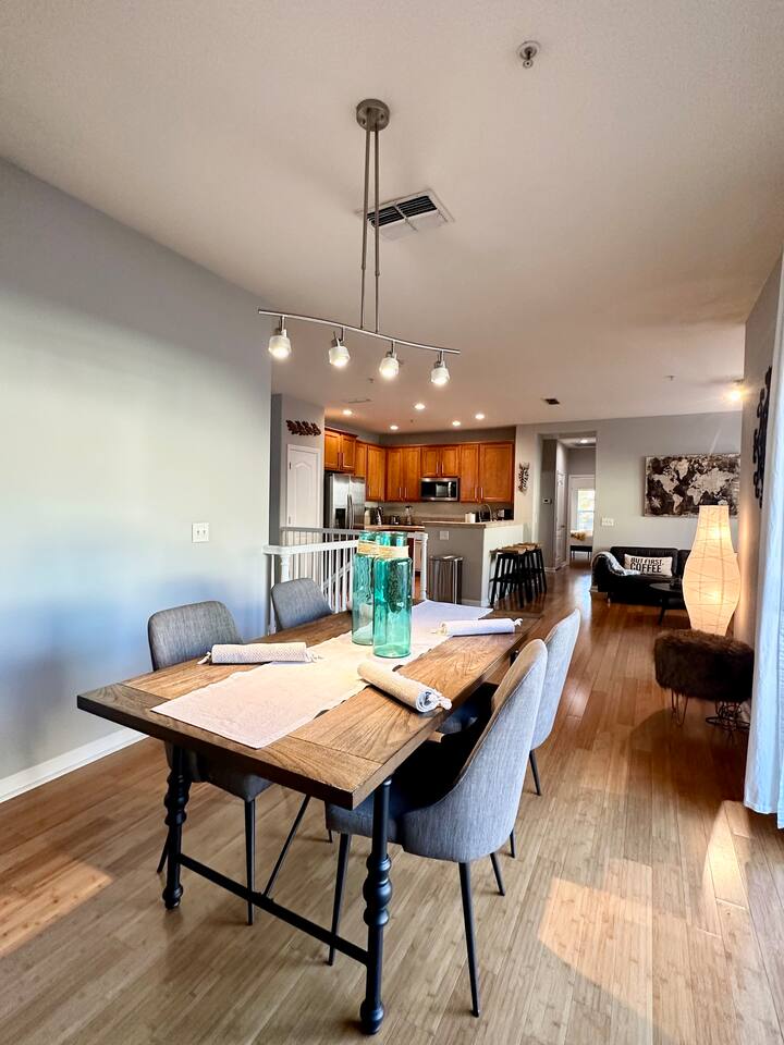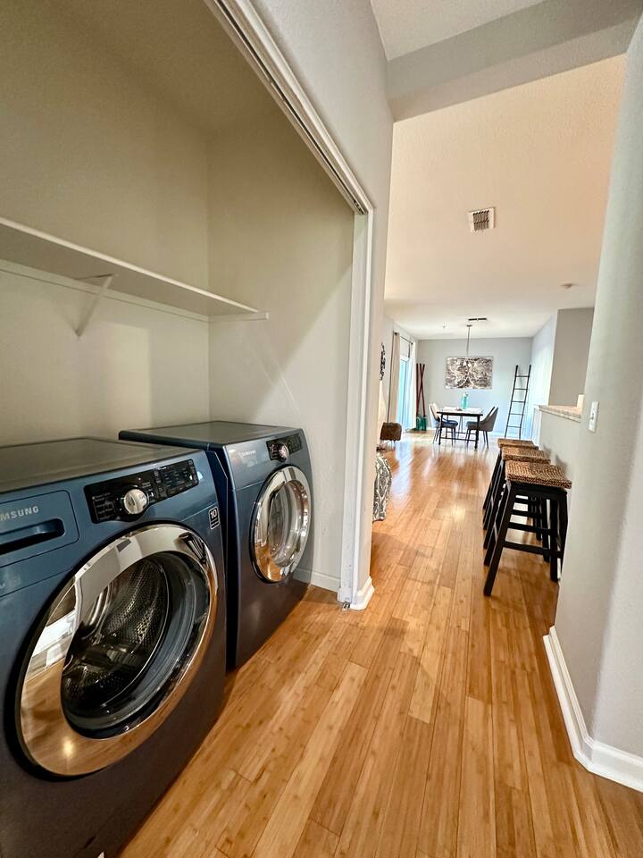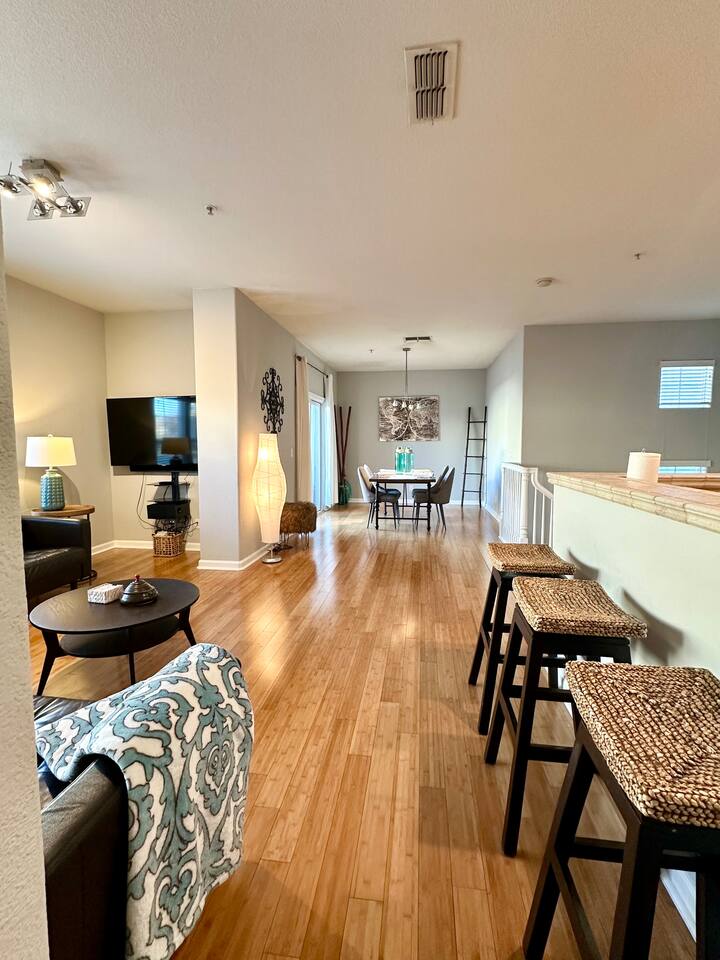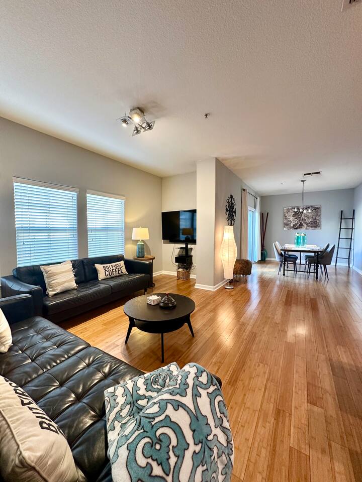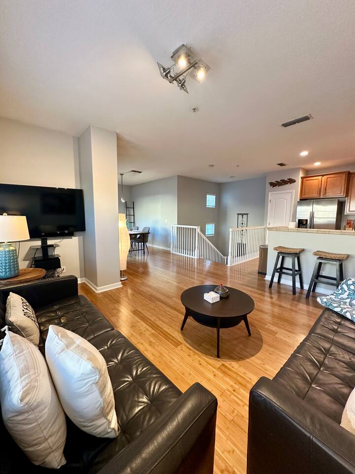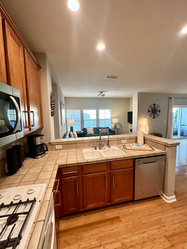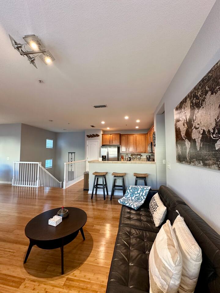 Enjoy your stay at this centrally located Town-House with 2 bedrooms, 2 bathrooms, 2 car garage, Sleeps 6, 1500 SQ/F 2 Story with modern finishes and Incredible amenities, Swimming Pool, Spa, Surrounded by Parks, walking distance to Tennis Courts, Biking trails, Dog Parks and Shopping.