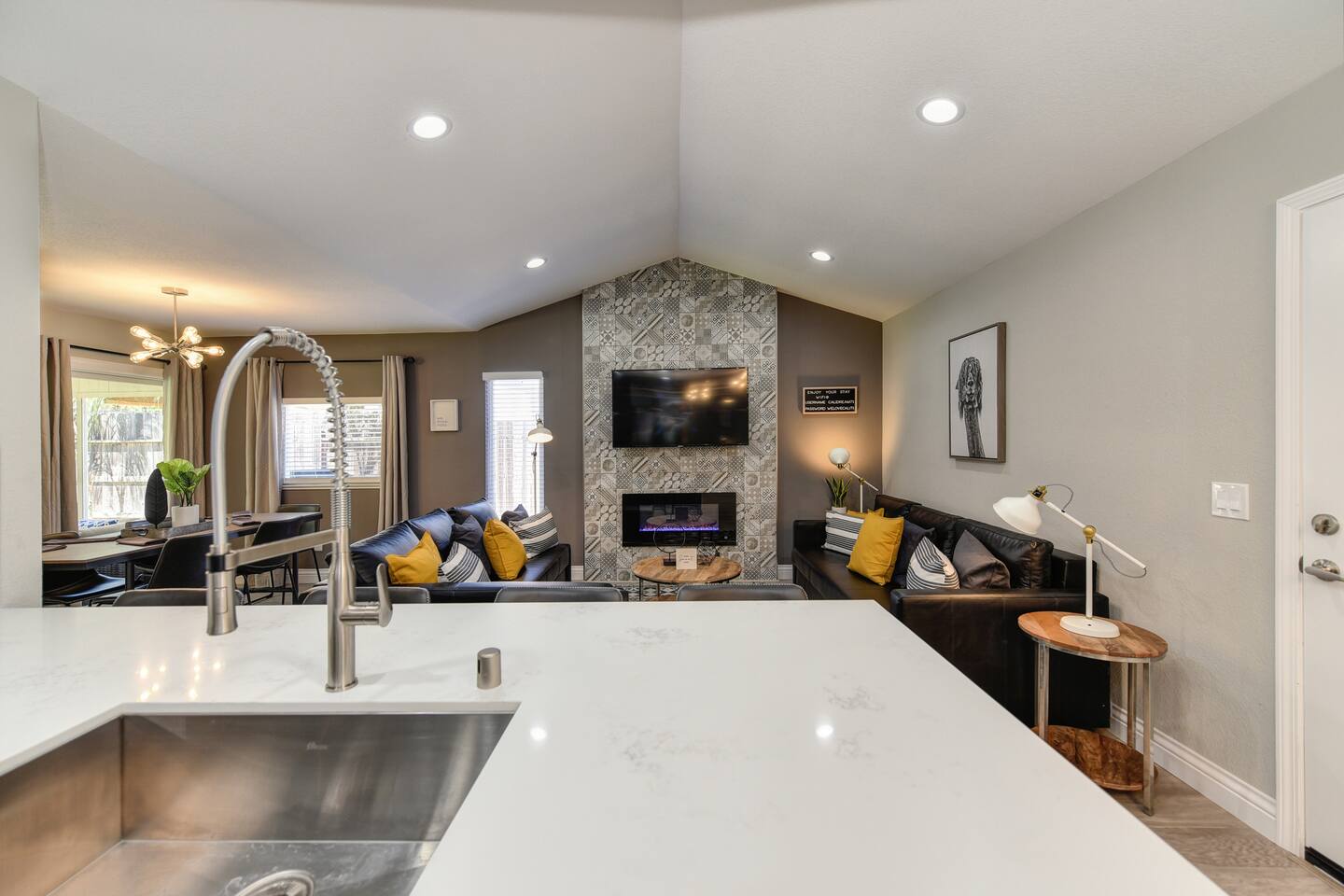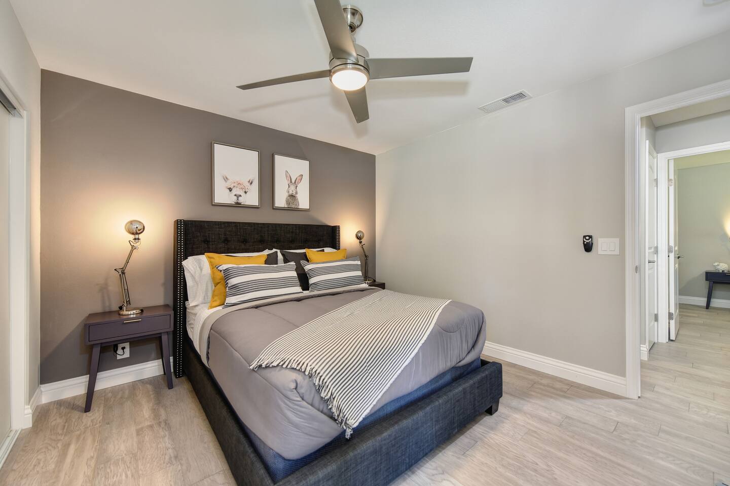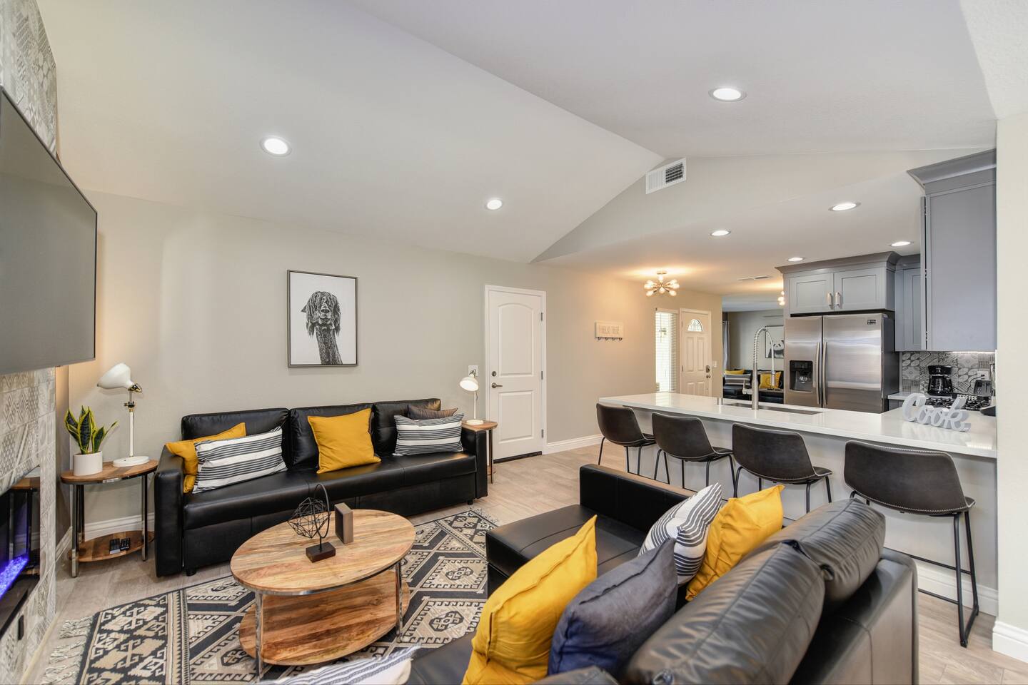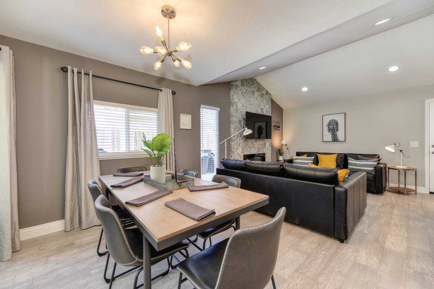 A spacious home and luxurious grounds in a community that's fun and convenient to shopping, entertainment, and fine dining. The single story luxury home futures: - Brand new custom tile in bathrooms and wood floors throughout the house. - Master bedroom with queen bed, brand new luxury Simmons Plush Beautyrest mattress - (Sleeps 2) and a twin memory foam guest foldout bed (Sleeps 1) 55" Flat Screen SMART TV, large closet - Brand new master bathroom with custom tile throughout, custom tile and a walk-in shower, custom vanity and a toilet area - Second bedroom with queen bed, brand new luxury Simmons Plush Beautyrest mattress - (Sleeps 2) and 32" Flat Screen SMART TV, and a closet, brand new private bathroom with soaking tub, custom vanity and a toilet area. Third bedroom with queen bed, brand new Simmons Plush Beautyrest mattress - (Sleeps 2) 32" Flat Screen SMART TV, and a closet - Contemporary gourmet kitchen, fully stocked and set-up with brand new high end stainless steel appliances, quartz counter tops, custom tile backsplash. A dining area with high end furnishings (seating 6) - Open concept floor plan Living area with two large brand new leather queen pullout sofas - (Sleeps 4) and a 60" Flat Screen SMART HDTV and a beautiful fireplace. Open concept floor plan Family Room area with two large brand new leather queen pullout sofas - (Sleeps 4) and a 55" Flat Screen SMART HDTV. Stunning oversized back yard with amazing covered patio with comfy conversation set and a separate outdoor patio with a swing and a barbecue. Brand new high end front loader Samsung Washer and Drier. - Attached Garage for 2 cars with private driveway and plenty of street parking. *NOTE. We take great pleasure in regularly updating and enhancing our property. This includes incorporating new decorations, throw pillows and blankets, furniture, and bedding, and refreshing the color scheme. Consequently, the current setup may not exactly match the images featured in the listing. However, we guarantee that all necessary amenities are provided to ensure your stay is enjoyable and comfortable.