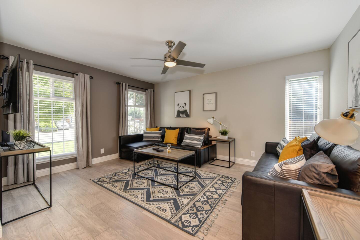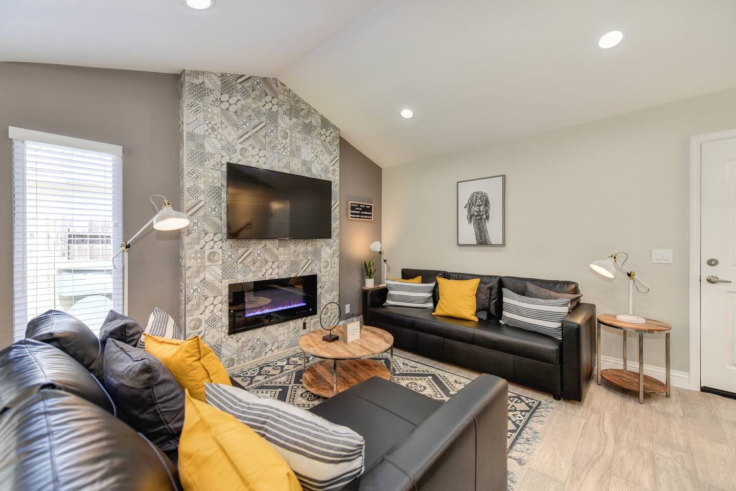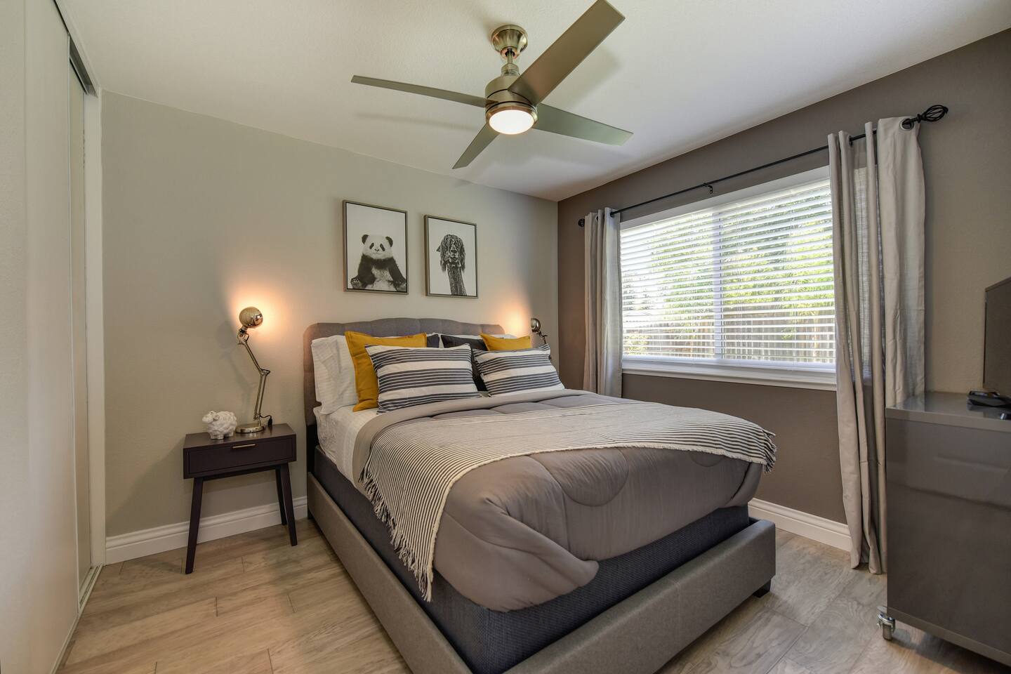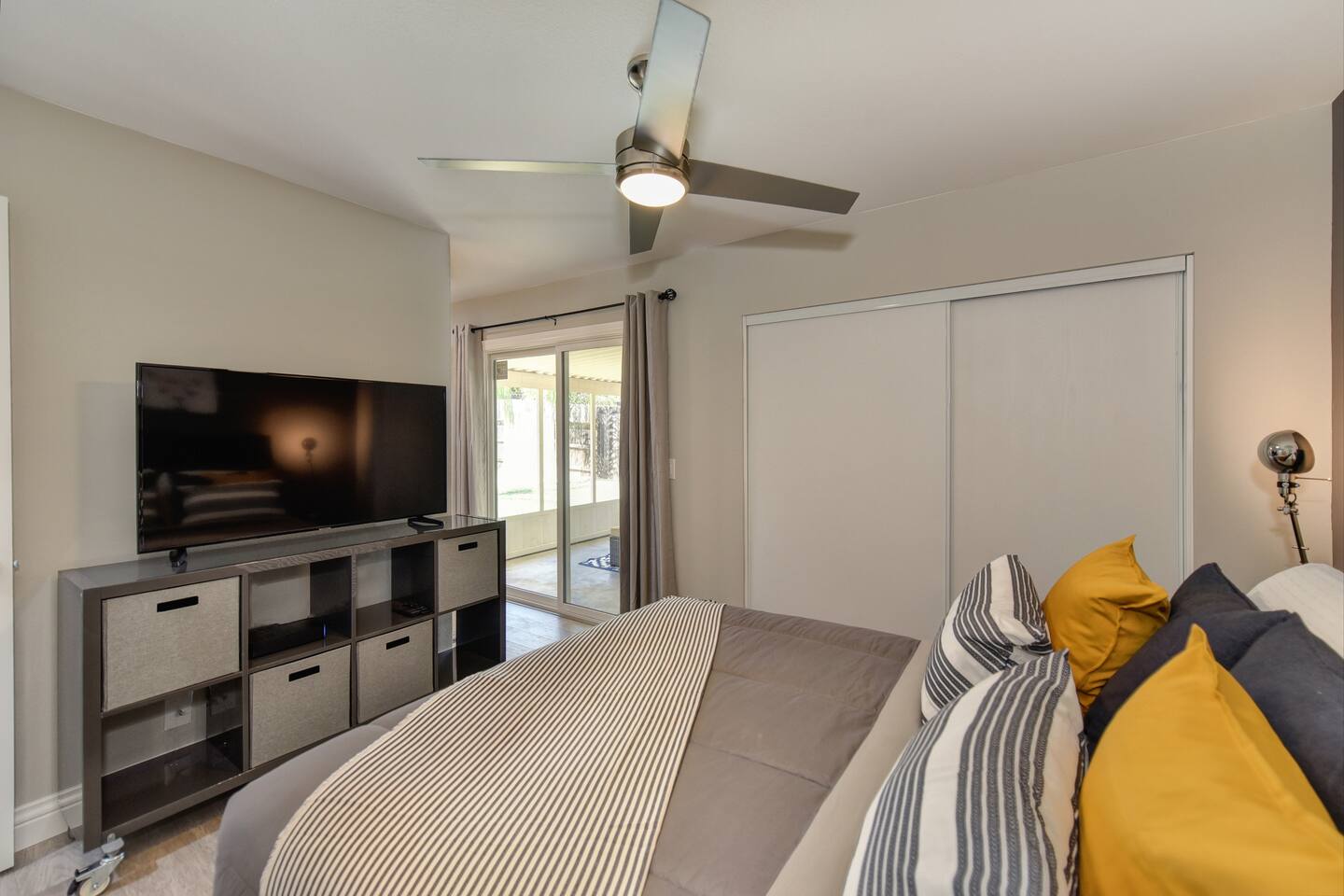 A spacious home and luxurious grounds in a community that's fun and convenient to shopping, entertainment, and fine dining. The single story luxury home futures: - Brand new custom tile in bathrooms and wood floors throughout the house. - Master bedroom with queen bed, brand new luxury Simmons Plush Beautyrest mattress - (Sleeps 2) and a twin memory foam guest foldout bed (Sleeps 1) 55" Flat Screen SMART TV, large closet - Brand new master bathroom with custom tile throughout, custom tile and a walk-in shower, custom vanity and a toilet area - Second bedroom with queen bed, brand new luxury Simmons Plush Beautyrest mattress - (Sleeps 2) and 32" Flat Screen SMART TV, and a closet, brand new private bathroom with soaking tub, custom vanity and a toilet area. Third bedroom with queen bed, brand new Simmons Plush Beautyrest mattress - (Sleeps 2) 32" Flat Screen SMART TV, and a closet - Contemporary gourmet kitchen, fully stocked and set-up with brand new high end stainless steel appliances, quartz counter tops, custom tile backsplash. A dining area with high end furnishings (seating 6) - Open concept floor plan Living area with two large brand new leather queen pullout sofas - (Sleeps 4) and a 60" Flat Screen SMART HDTV and a beautiful fireplace. Open concept floor plan Family Room area with two large brand new leather queen pullout sofas - (Sleeps 4) and a 55" Flat Screen SMART HDTV. Stunning oversized back yard with amazing covered patio with comfy conversation set and a separate outdoor patio with a swing and a barbecue. Brand new high end front loader Samsung Washer and Drier. - Attached Garage for 2 cars with private driveway and plenty of street parking. *NOTE. We take great pleasure in regularly updating and enhancing our property. This includes incorporating new decorations, throw pillows and blankets, furniture, and bedding, and refreshing the color scheme. Consequently, the current setup may not exactly match the images featured in the listing. However, we guarantee that all necessary amenities are provided to ensure your stay is enjoyable and comfortable.