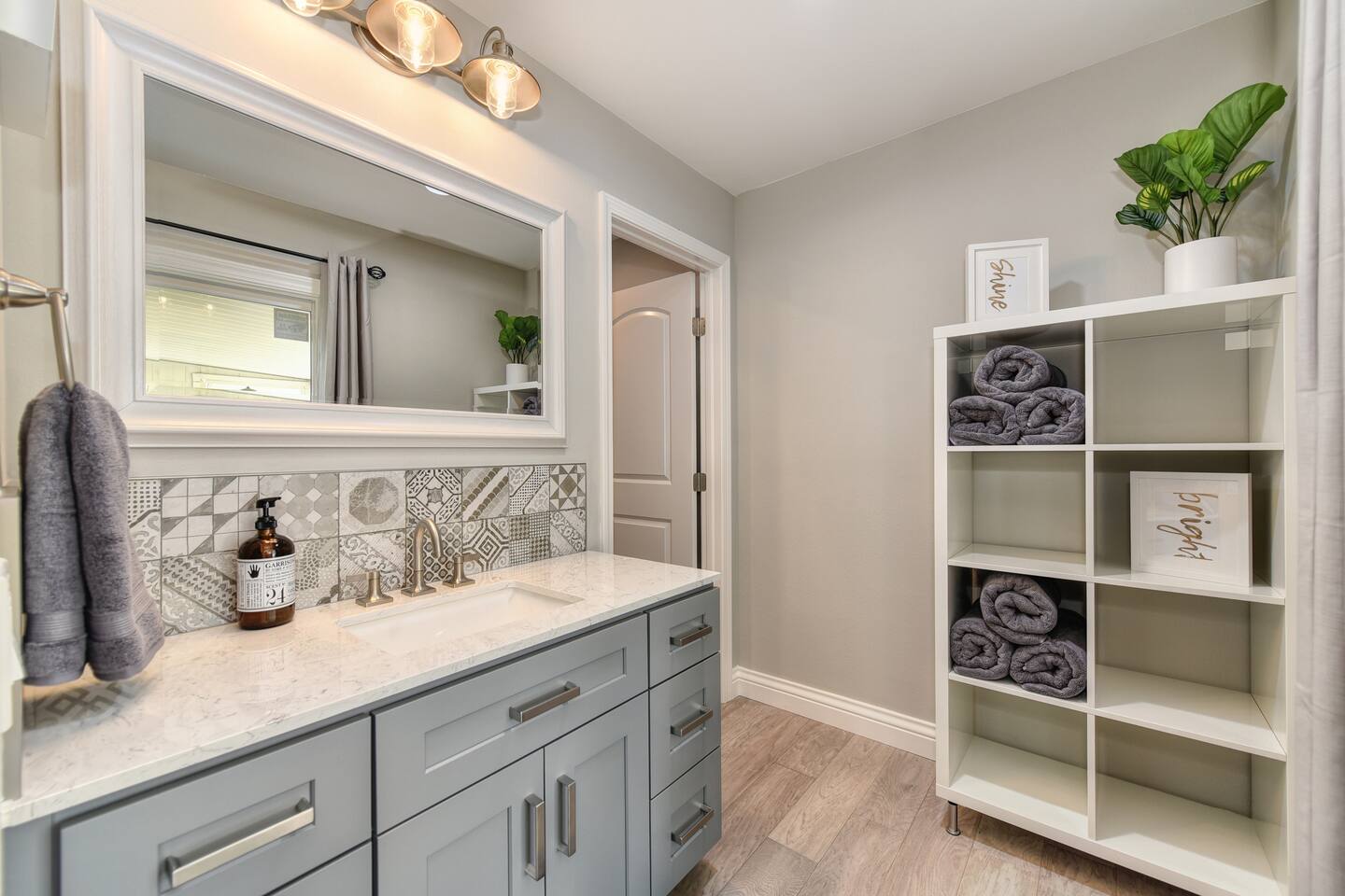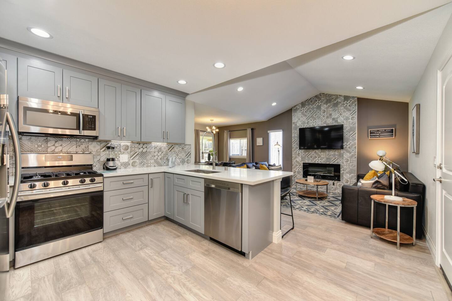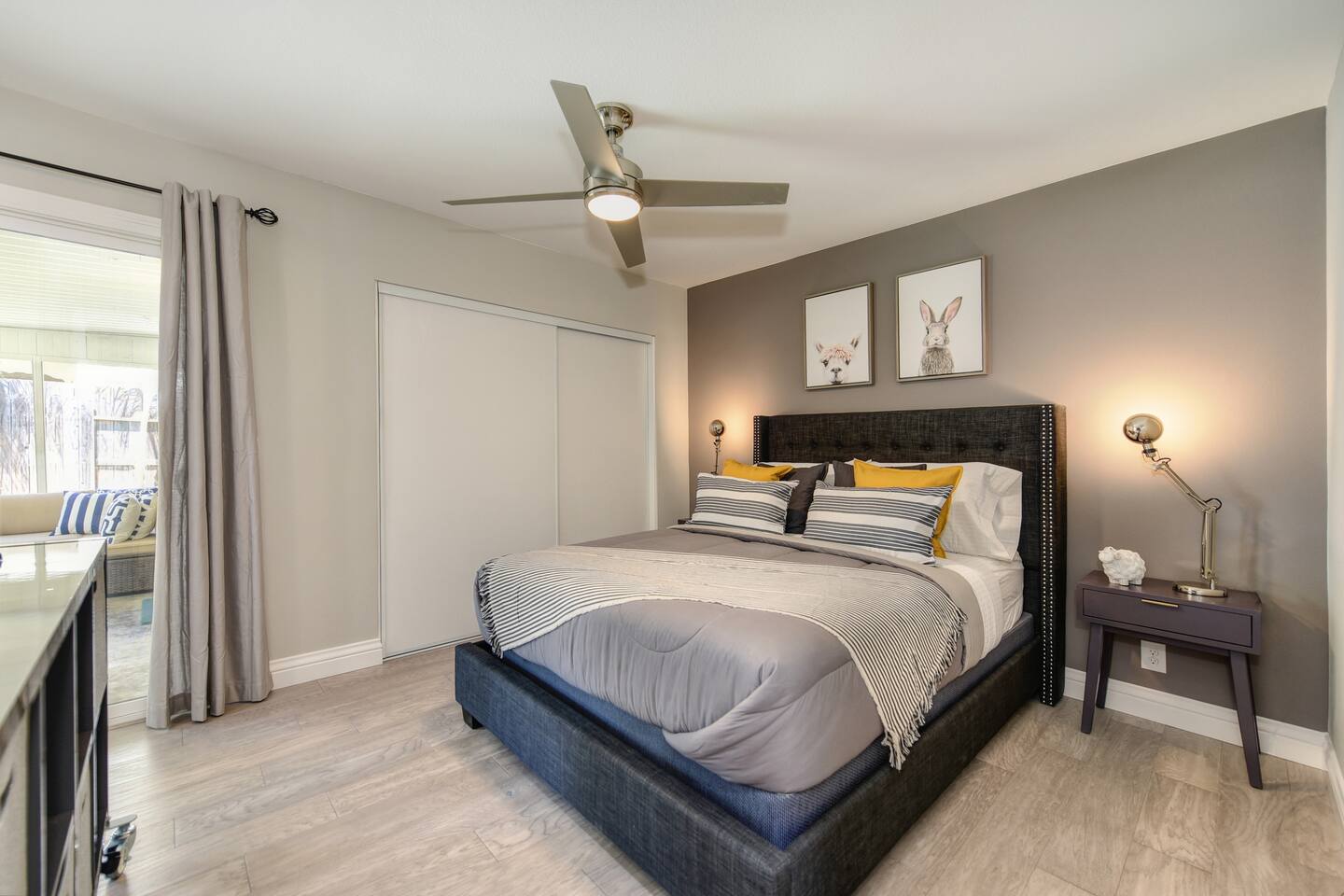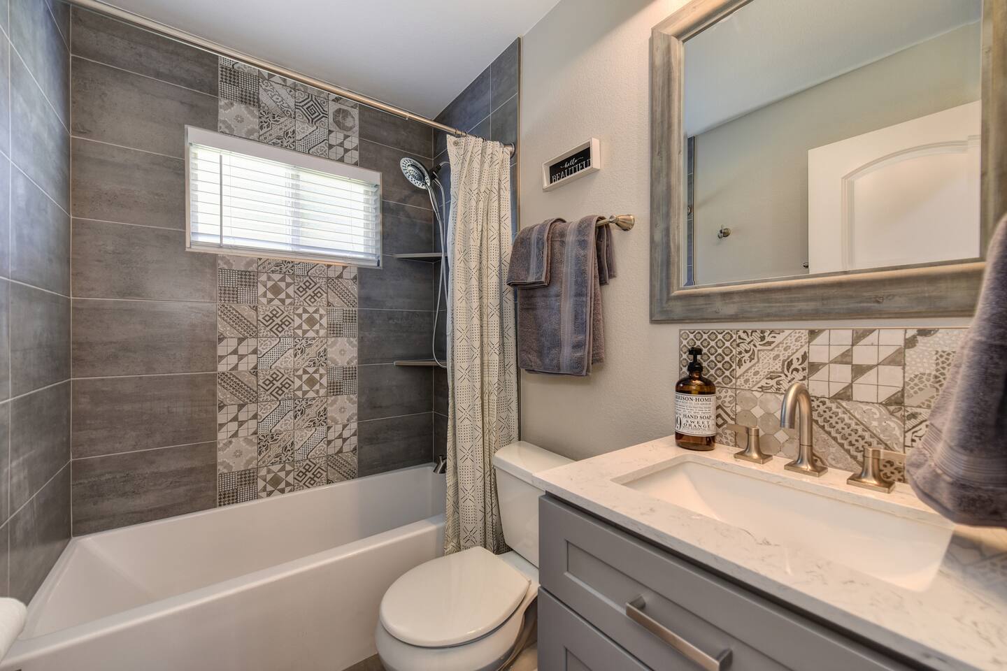 A spacious home and luxurious grounds in a community that's fun and convenient to shopping, entertainment, and fine dining. The single story luxury home futures: - Brand new custom tile in bathrooms and wood floors throughout the house. - Master bedroom with queen bed, brand new luxury Simmons Plush Beautyrest mattress - (Sleeps 2) and a twin memory foam guest foldout bed (Sleeps 1) 55" Flat Screen SMART TV, large closet - Brand new master bathroom with custom tile throughout, custom tile and a walk-in shower, custom vanity and a toilet area - Second bedroom with queen bed, brand new luxury Simmons Plush Beautyrest mattress - (Sleeps 2) and 32" Flat Screen SMART TV, and a closet, brand new private bathroom with soaking tub, custom vanity and a toilet area. Third bedroom with queen bed, brand new Simmons Plush Beautyrest mattress - (Sleeps 2) 32" Flat Screen SMART TV, and a closet - Contemporary gourmet kitchen, fully stocked and set-up with brand new high end stainless steel appliances, quartz counter tops, custom tile backsplash. A dining area with high end furnishings (seating 6) - Open concept floor plan Living area with two large brand new leather queen pullout sofas - (Sleeps 4) and a 60" Flat Screen SMART HDTV and a beautiful fireplace. Open concept floor plan Family Room area with two large brand new leather queen pullout sofas - (Sleeps 4) and a 55" Flat Screen SMART HDTV. Stunning oversized back yard with amazing covered patio with comfy conversation set and a separate outdoor patio with a swing and a barbecue. Brand new high end front loader Samsung Washer and Drier. - Attached Garage for 2 cars with private driveway and plenty of street parking. *NOTE. We take great pleasure in regularly updating and enhancing our property. This includes incorporating new decorations, throw pillows and blankets, furniture, and bedding, and refreshing the color scheme. Consequently, the current setup may not exactly match the images featured in the listing. However, we guarantee that all necessary amenities are provided to ensure your stay is enjoyable and comfortable.